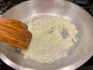 Place a large skillet, or as I prefer, a Dutch oven, on medium heat and add 2 tablespoon of olive oil. When the pan is hot, add the onions and sauté for a few minutes until soft.